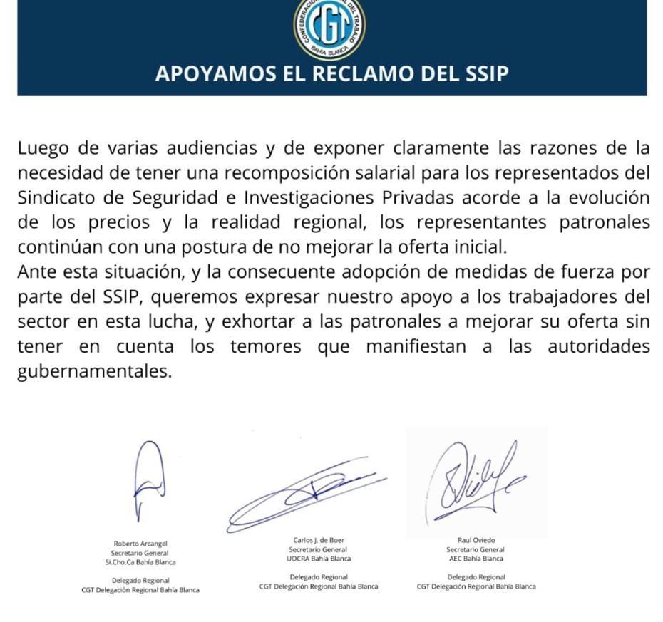 La Confederación General del Trabajo (CGT) Regional Bahía Blanca expresó su apoyo al reclamo salarial del Sindicato de Seguridad e Investigaciones Privadas (S.S.I.P.), en el marco del conflicto paritario que mantiene el gremio con el sector empresario.
