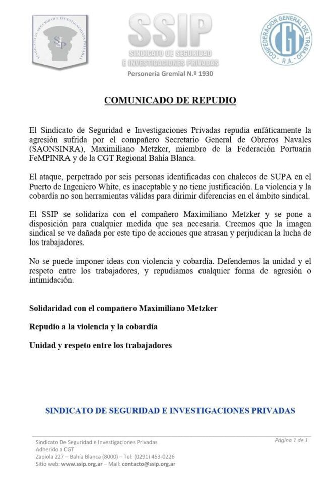 El Sindicato de Seguridad e Investigaciones Privadas repudia enfáticamente la agresión sufrida por el compañero Secretario General de Obreros Navales (SAONSINRA), Maximiliano Metzker, miembro de la Federación Portuaria FeMPINRA y de la CGT Regional Bahía Blanca.