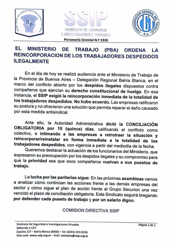 Desde el S.S.I.P. destacamos la actuación del Ministerio de Trabajo y su compromiso para que la prioridad sea que esos compañeros vuelvan a sus puestos.
