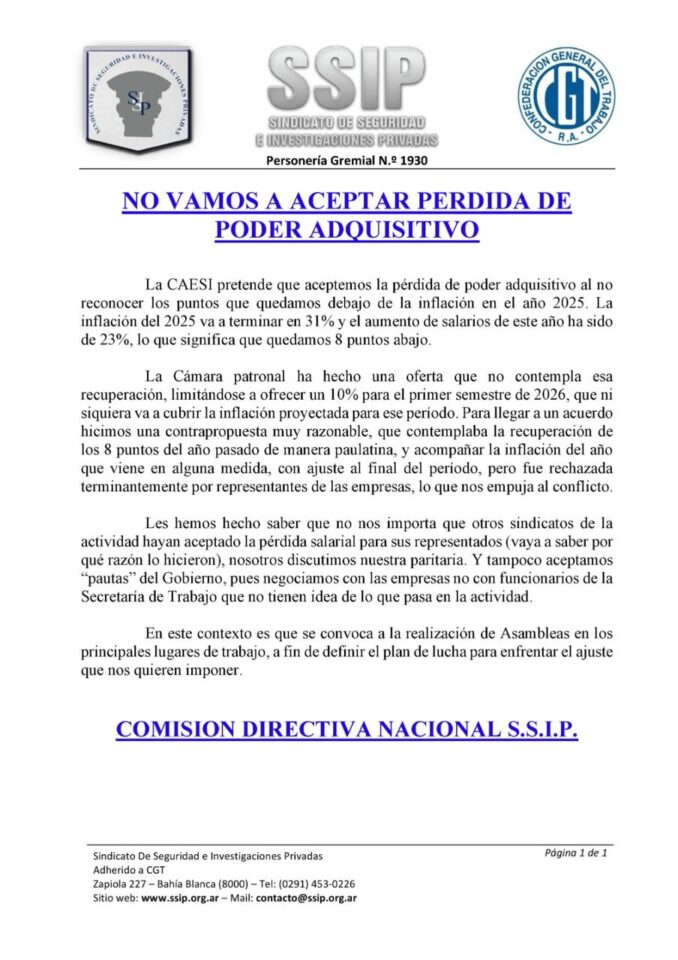La CAESI pretende que aceptemos la pérdida de poder adquisitivo al no reconocer los puntos que quedamos debajo de la inflación en el año 2025. La inflación del 2025 va a terminar en 31% y el aumento de salarios de este año ha sido de 23%, lo que significa que quedamos 8 puntos abajo.