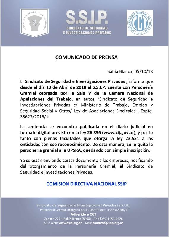 El Sindicato de Seguridad e Investigaciones Privadas informa que desde el día 13 de Abril de 2018 el S.S.l.P. cuenta con Personería Gremial otorgada por la Sala V de la Cámara Nacional de Apelaciones del Trabajo, en autos «Sindicato de Seguridad e Investigaciones Privadas c/ Ministerio de Trabajo, Empleo y Seguridad Social y Otros/Ley de Asociaciones Sindicales», Expte. 33623/2016/1.